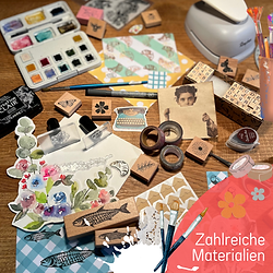 Kartengestalten mit Aquarellfarben und der Mix-Media-Technik Workshop von und mit Sylvia In diesen 2 Stunden kannst Du Gruß,- Gutschein- und andere Anlasskarten mit Aquarell, Stempeln und zahlreichen Materialien erstellen. Ich begleite euch mit Inspirationen, kreativen Impulsen und stelle euch vielfältige Materialien zur Verfügung. Nach ein paar Grundlagen in der Aquarelltechniken, legen wir direkt los und kombinieren einfache Aquarellmotive mit verschiedene Materialien & Techniken. Am Ende des Kursen kannst Du zahlreiche Klapp-, Postkarte, kleine Kärtchen im Holzaufsteller oder Geschenkanhänger mit nach Hause nehmen und/oder Deinen Liebsten überreichen. Mit Liebe gemacht und garantiert ein Unikat. Gestellte Materialien: Aquarellkasten, -papier & -pinsel Filz- und Buntstifte, Fineliner, Effekt-/Goldstifte Tonpapier, Aufkleber & Bänder Motivstempel (Blumen, Vögel, Muster, Obst, Schmetterlinge,...) Schriftzügen zum Stempel, Abschreiben oder Durchpausen Etiketten- und Lochstanzen (für Geschenketiketten) Kleber, Scheren, Klebepads Außerdem kannst Du gerne folgendes mitbringen: eigene Fotos, Sprüche oder Lieblingsfarben deine Lieblingsbastelschere, Cutter oder andere Materialien, die Du gerne verwenden möchtest